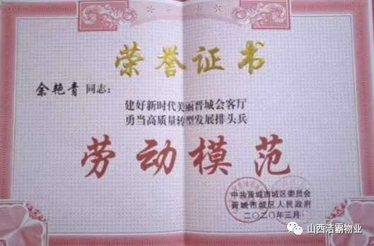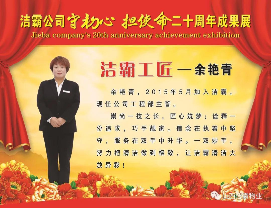 余艷青同志自2015年進入潔霸以來,一直奮斗在工程部的第一線從事主管工作。工作中,余艷青同志愛崗敬業(yè),遵守職業(yè)道德,為人誠實守信;她熱愛工作,對待客戶熱情周到、耐心細致;工作中團結(jié)同事,責(zé)任心強,吃苦耐勞,服從大局,以公司的利益為重。在我市開展的“三洗六見一紅旗”活動和全國文明城市的創(chuàng)建活動中,她帶領(lǐng)員工高標準、高質(zhì)量、高效率地完成清洗美化工作,為扮靚晉城形象,打造城市優(yōu)美環(huán)境做出了突出貢獻。先后多次被公司評為優(yōu)秀員工等,2019年在公司成立20周年慶之際,她又被公司授予“潔霸工匠”稱號。