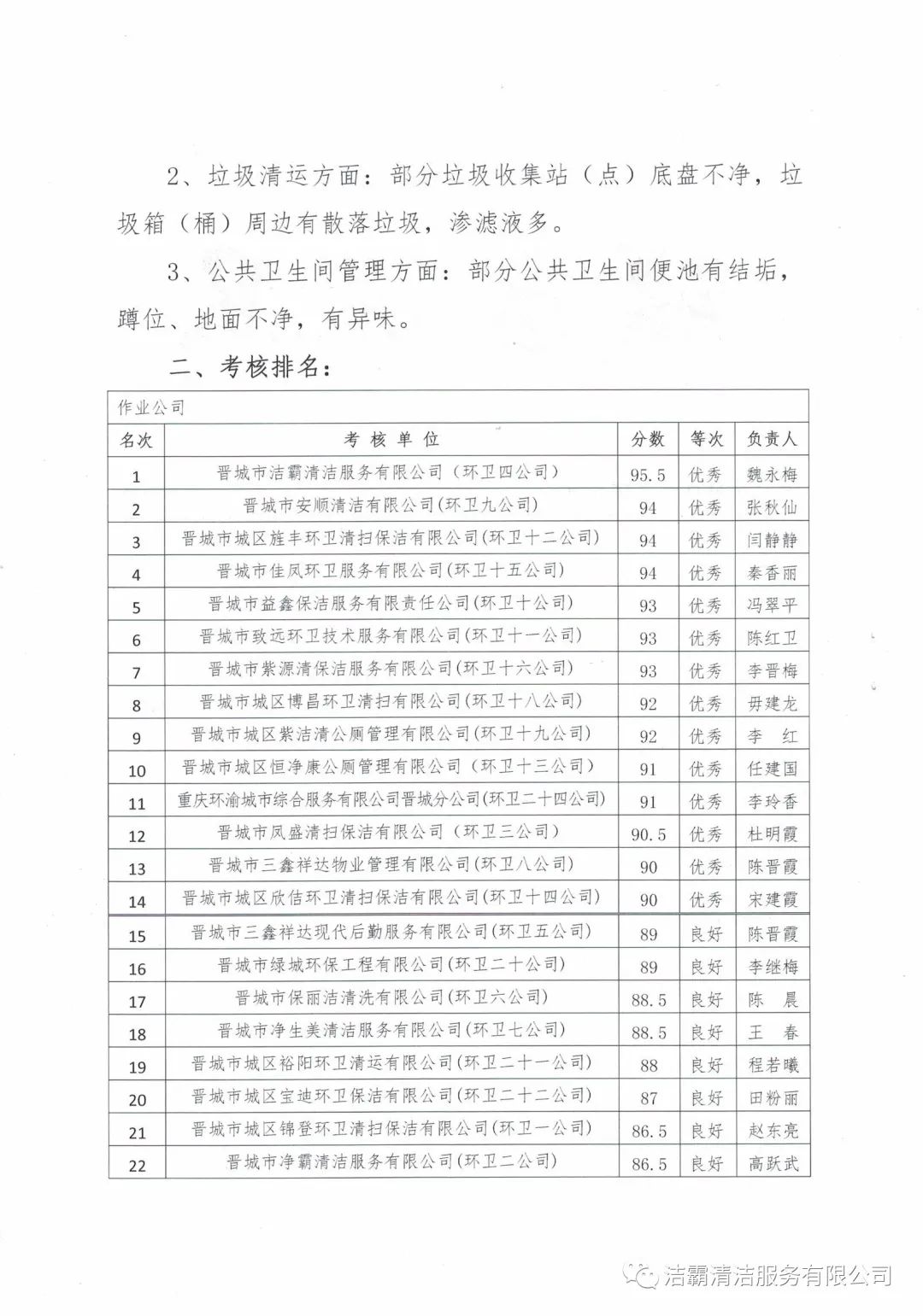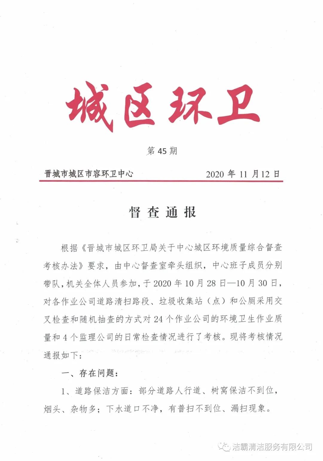 2020年10月28日—10月30日,晉城市城區(qū)市容環(huán)衛(wèi)中心由中心督查室牽頭組織,中心班子成員分別帶隊,機關(guān)全體人員參加,對各作業(yè)公司道路清掃路段、垃圾收集站(點)和公廁采用交叉檢查和隨機抽查的方式對24個作業(yè)公司的環(huán)境衛(wèi)生作業(yè)質(zhì)量和4個監(jiān)理公司的日常檢查情況進(jìn)行了考核。晉城市潔霸清潔服務(wù)股份有限公司所屬的環(huán)衛(wèi)四公司分?jǐn)?shù)最高,名列第一。