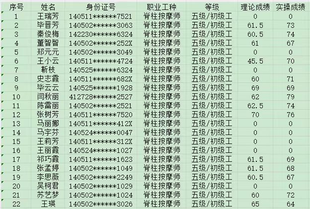 晉城市潔霸清潔服務(wù)股份有限公司職業(yè)技能等級認定中心現(xiàn)將2024年10月13日認定人員成績公示如下:
